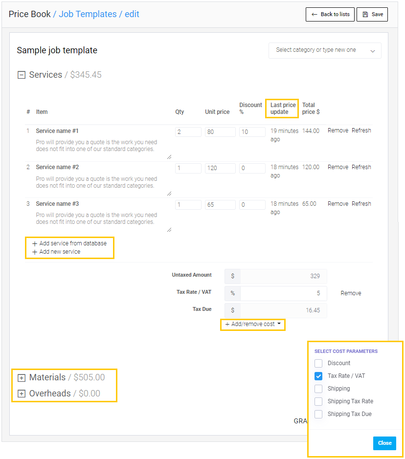Avoid redundant and time-consuming work by using Job Templates. In 1 single template - which is part of your Price Book - you can add 1 or multiple services along with the necessary list of supplies (+ overheads if necessary). This is a fantastic tool to define both simple and very complex jobs that include a suite of services. Moreover, any job template can be synchronized with your services/supplies/overheads database in 1 click (the services/supplies/overheads are also part of your Price Book).